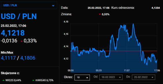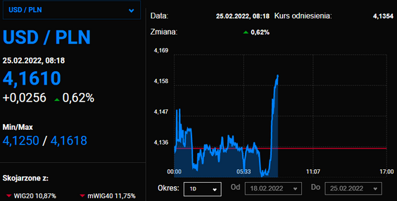 O poranku euro umacniało się względem złotego o 0,7 proc. Za europejską walutę płacono 4,66 zł. Z kolei za dolara zapłacić trzeba obecnie 4,16 zł, a franka szwajcarskiego - 4,5 zł. Cena złota przebiła barierę 1,9 tys. dolarów za uncję, z kolei cena baryłki ropy WTI sięga 95 dolarów.