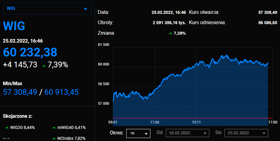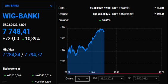 Indeks WIG20 rośnie o około 8 proc., mWIG40 o 7,2 proc., a sWIG80 - o 3,9 proc. Wśród liderów wzrostów na rynku dominują spółki ukraińskie. Notowania KSG Agro, Kernela oraz IMC rosną o odpowiednio 23,2 proc., 20,6 proc. i 19.6 proc. Na zielono świecą także wszystkie branżowe indeksy z WIG-spożywczym na czele.