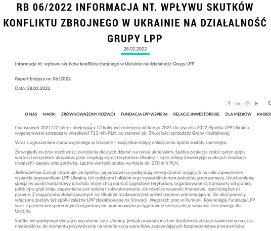LPP zamierza dokonać pełnego odpisu wartości aktywów w Ukrainie, łącznie ok. 270 mln zł. Spółka zawiesza na czas nieokreślony działalność na rynku ukraińskim. - Ze względu na brak możliwości określenia dalszych działań na rynku ukraińskim, spółka zamierza zrobić pełen odpis wartości wszystkich aktywów, jakie znajdują się na terytorium Ukrainy - są to sklepy (inwestycje w obcych środkach trwałych), zapasy oraz gotówka – informuje zarząd LPP w komunikacie.