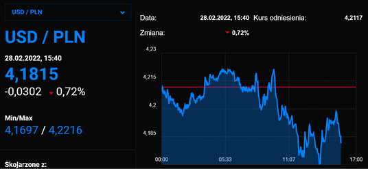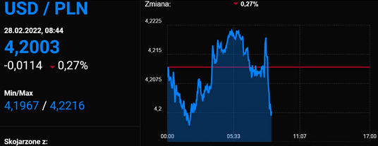 Złoty mocno traci na wartości względem najważniejszych walut. Za euro inwestorzy płacą już prawie 4,70 zł, o 5 groszy więcej niż w piątek, a notowania dolara osiągnęły już prawie 4,20 zł, co jest poziomem o ok. 8 groszy wyższym niż przed weekendem. Tym samym amerykańska waluta jest najdroższa od blisko dwóch lat.