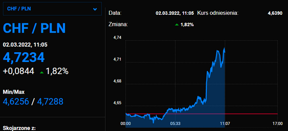 Nic nie wskazuje na to, żeby rodzima waluta miała się nagle umocnić. Po godzinie 11 za euro płacono już ponad 4,8 zł, a dolara - 4,33 zł. Frank szwajcarski również umacnia się względem złotego. Dziś podskoczył o ponad 1,8 proc. Za szwajcarską walutę trzeba zapłacić ponad 4,72 zł.