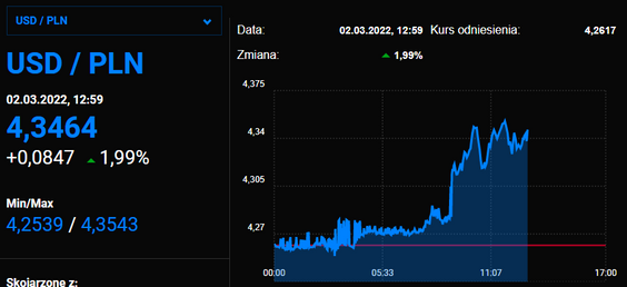 W pierwszych minutach handlu indeks największych firm WIG20 zyskuje 0,07 proc. Z kolei brytyjski FTSE rośnie o 0,7 proc. Przyglądając się sytuacji na walutach widać, że złotówka ciągle osłabia się względem dolara oraz euro. O poranku za amerykańską walutę płacono 4,28 zł, a europejską - ponad 4,77 zł. Z kolei za franka szwajcarskiego płacono 4,68 zł. Cena baryłki ropy WTI rosła o niemal 6,5 proc. do ponad 110 dolarów.