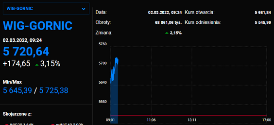 Na warszawskim parkiecie ciągle dominują wzrosty. WIG rośnie o 1,3 proc., WIG20 o 2,7 proc., a sWIG80 o 1 proc. mWIG40 spada natomiast o niemal 1 proc. Indeksowi średnich firm ciąży wyprzedaż akcji ukraińskich spółek, przede wszystkim Kernela, którego papiery tanieją dziś o niemal 10 proc. Wspomniana wyprzedaż walorów ukraińskich dołuje także indeks WIG-spożywczy, który zniżkuje o 5,7 proc. Najsilniejszy pozostaje nadal WIG-górnictwo, który rośnie już o przeszło 7,4 proc.
