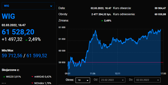 Ostatecznie niemal wszystkie kluczowe indeksy zakończyły sesję na plusie. WIG podskoczył w czwartek o 2,5 proc., WIG20 o 3,9 proc., a sWIG80 o 1,4 proc. Jedynie mWIG40 zniżkował o 0,3 proc. Jest to efekt przede wszystkim słabej kondycji ukraińskich spółek, w szczególności Kernela, którego akcje spadły o 23,8 proc.