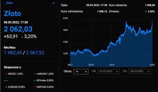 Złoto dzisiaj znów drożeje, o około 0,4 proc., i jest ponownie powyżej 2000 USD za uncję. Analitycy Goldman Sachs twierdzą, że to jeszcze nie koniec wzrostów. Ich zdaniem cena złota może w perspektywie sześciu miesięcy osiągnąć poziom 2500 USD. Wcześniejsza ich prognoza mówiła o poziomie 2050 USD za uncję.