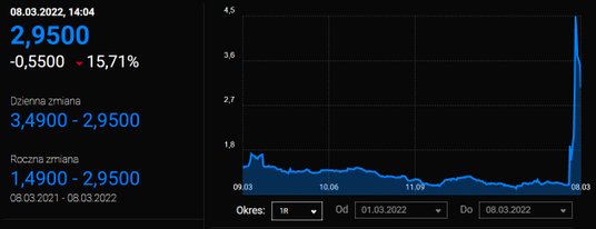 Spółki, które mocno zyskiwały w ostatnim czasie, wraz z wybuchem wojny na Ukrainie, korygują dzisiaj wzrosty. Akcje Lubawy tanieją o ponad 15 proc. Wojas traci około 10 proc., a Zremb około 9 proc. Ci, którzy mieli ich akcje przed wybuchem wojny nadal są jednak na solidnych plusach, czego dowodem jest chociażby poniższy wykres Lubawy.