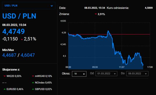 Inwestorzy w napięciu czekali dzisiaj na decyzję RPP. Ta ostatecznie podniosła stopy procentowe o 75 pkt bazowych. Reakcje rynkowe? Złoty oddał cześć zysków wypracowanych w ciągu dnia, ale i tak jest mocniejszy niż wczoraj. Decyzja ta mocniej dotknęła banki. Indeks WIG - Banki, który rósł w ciągu dnia nawet ponad 4 proc. obecnie jest pod kreską. Dużo dzieje się natomiast w otoczeniu. Presja na ceny surowców w związku z szykowanym embargiem na rosyjską ropę naftową przez USA i Wielką Brytanię przekłada się na spadki na Wall Street. Odczuwa to także GPW. WIG20 na ostatniej prostej traci ponad 1,5 proc.