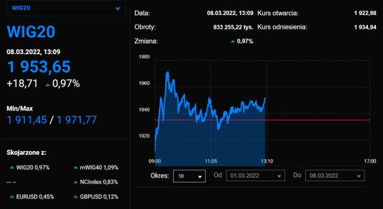 Pojawiają się informację, że Stany Zjednoczone mają nałożyć embargo na rosyjską ropę naftową, gaz i węgiel. To podbija notowania surowców. Ropa drożeje o ponad 4 proc. Kontrakty na amerykańskie indeksy świecą już na czerwono. Również europejskie wskaźniki oddają wcześniejsze wzrosty. WIG20 jest 0,5 proc. pod kreską.