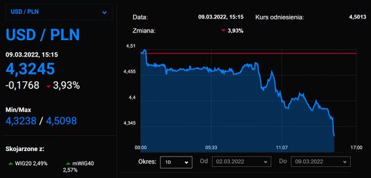 Kurs USD/PLN spada o blisko 4 proc., do około 4,32 zł. Złoty umacnia się również wobec innych głównych walut. Za euro trzeba zapłacić 4,77 zł, wobec nawet 5 zł w szczytowym momencie w poniedziałek.