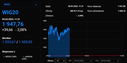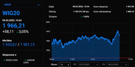 Indeks największych spółek zamknął się na poziomie 1973 pkt. Jeśli dobre nastroje utrzymają się w kolejnych dniach, notowania mogą wrócić nad psychologiczną barierę 2000 pkt. Notowania LPP wzrosły o 15,8 proc., a Allegro o ponad 11 proc. Na uwagę zasługują również banki: PKO BP i Pekao zyskały około 10,8 proc.