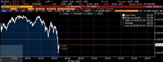 Gatunek Brent drożał na początku dzisiejszej sesji, ale obecnie notowania zeszły pod kreskę. Cena wynosi ponad 127 USD. W dół idą także notowania WTI. Cena tego gatunku zeszła poniżej 122 USD.