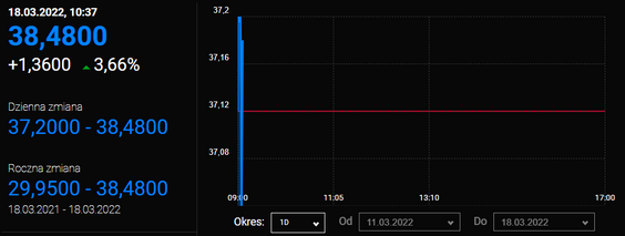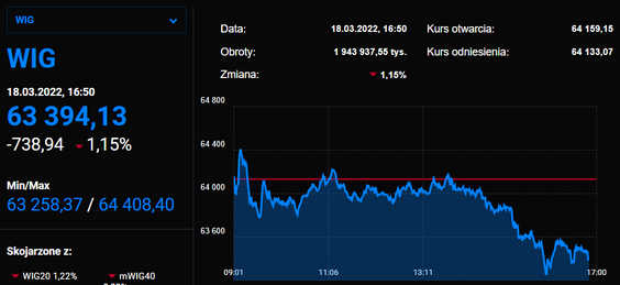 Indeks szerokiego rynku zakończył dzień zniżkując o 0,7 proc. Słabością raziły także WIG20 oraz sWIG80, których notowania spadły o odpowiednio 1,2 proc. i 0,2 proc. mWIG40 wzrósł o 0,4 proc. Wśród branżowych indeksów pozytywnie wyróżniały się WIG-chemia oraz WIG-spożywczy, które wzrosły w piątek o odpowiednio 6,1 proc. i 6,5 proc. Przyczyniły się do tego zapowiedzi rządzących dotyczące wsparcia rolników i tzw. "tarcza antyputinowska", mająca na celu pokrycie negatywnych skutków gospodarczego oderwania od Rosji.