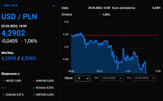 Wczorajsze straty naszej waluty praktycznie w całości zostały dzisiaj odrobione. Złoty zyskuje wobec dolara i euro ponad 1 proc. Amerykańska waluta kosztuje obecnie 4,29 zł, zaś euro 4,72 zł.