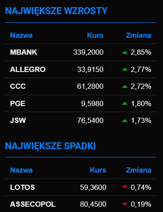 Na giełdzie w Warszawie na celowniku kupujący znalazły się duże spółki, co przekłada się na wzrosty cen akcji większości uczestników indeksu WIG20. Zwyżkom przewodzi Allegro, którego kurs rośnie o prawie 3 proc. Na solidnych plusach notowane są także akcje CCC i JSW. Do zwyżek podłączyły się również banki. Na drugim biegunie, wśród przecenionych firm, są jedynie papiery Lotosu i Asseco.