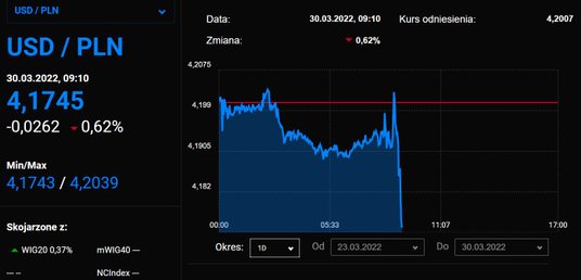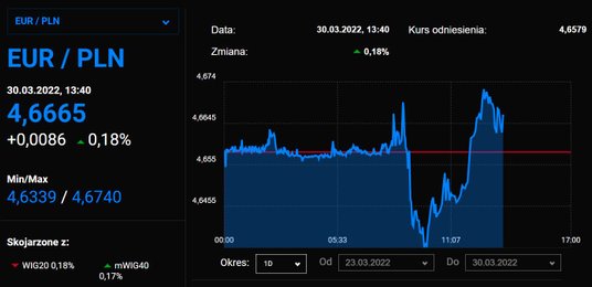 W pierwszej połowie sesji złoty umacniał się wobec głównych walut. Kurs EUR/PLN spadał, jednak obecnie rośnie o 0,2 proc. Wobec dzisiejszego dołka złoty osłabił się względem euro o trzy grosze.