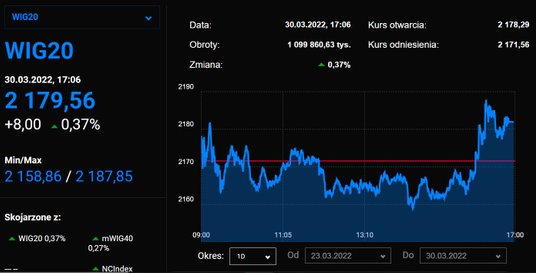 Indeks największych spółek wzrósł o blisko 0,4 proc. i po raz trzeci z rzędu zakończył dzień na plusie. To dobry wynik biorąc pod uwagę, że główne benchmarki w Europie traciły ponad 1 proc., a sesja na Wall Street rozpoczęła się od spadków.