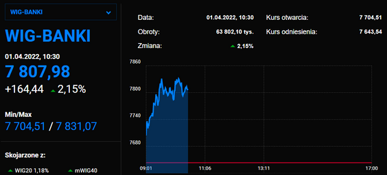 Przed południem liderami zwyżek indeksu największych spółek są mBank oraz Bank Pekao, których notowania rosną o odpowiednio 3,1 proc. i 2,7 proc. Z kolei indeks WIG-banki jest obecnie najsilniejszym indeksem branżowym i rośnie o 2,2 proc.