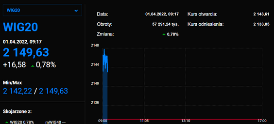 WIG na starcie dnia rośnie o 0,5 proc. Wraz z nim rosną także wszystkie główne indeksy rynku. WIG20 zwyżkuje o 0,7 proc., mWIG40 o 0,03 proc., a sWIG80 - o 0,6 proc. Patrząc na indeksy branżowe najlepiej radzi sobie WIG-odzież, a to za sprawą odbijającego po wczorajszych zniżkach LPP, które rośnie o ponad 2 proc.