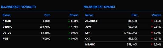 W gronie największych spółek na celowniku sprzedających są przede wszystkich Allegro, JSW i LPP. Ich notowania spadają po ponad 5 proc. Z kolei na szczycie tabeli jest PGNiG, którego akcje drożeją o ponad 3 proc.