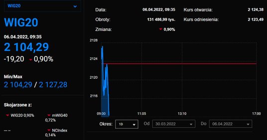 Indeks największych polskich spółek otworzył się na plusie, ale niedźwiedzie szybko przejęły inicjatywę. WIG20 spada obecnie o 0,9 proc. Notowania trzech spółek spadają po ponad 3 proc. Mowa o JSW, LPP i Allegro.