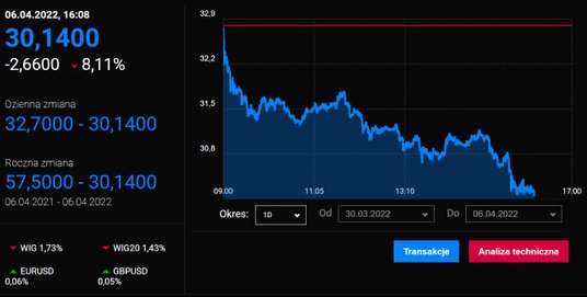 Notowania giganta e-commerce spadają dziś najmocniej spośród spółek w WIG20. Walory Allegro tanieją o ponad 8 proc., do około 30 zł.