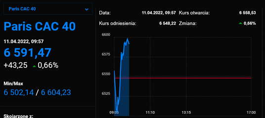 Indeksy na największych zachodnioeuropejskich rynkach akcji notują lekkie spadki. Pozytywnym wyjątkiem w tym gronie jest giełda w Paryżu, gdzie inwestorzy pozytywnie zareagowali na zwycięstwo urzędującego prezydenta Emmanuela Macrona w I turze wyborów prezydenckich. Główny indeks CAC40 zwyżkuje o prawie 0,7 proc.