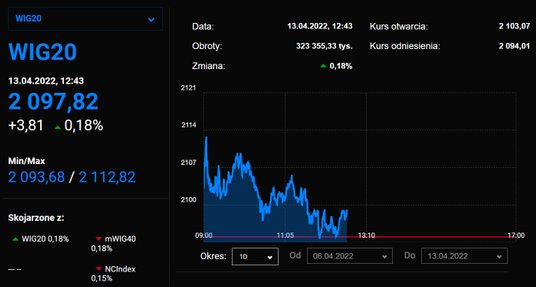 Na Starym Kontynencie przeważają sprzedający. Niemiecki DAX jest 0,8 proc. pod kreską, a francuski CAC40 traci 0,5 proc. Włoski FTSE MIB spada o 0,4 proc. Mimo tego, WIG20 daje radę utrzymać się na plusie. Byki walczą i indeks największych spółek oscyluje wokół 2100 pkt, co oznacza wzrost o 0,2 proc.