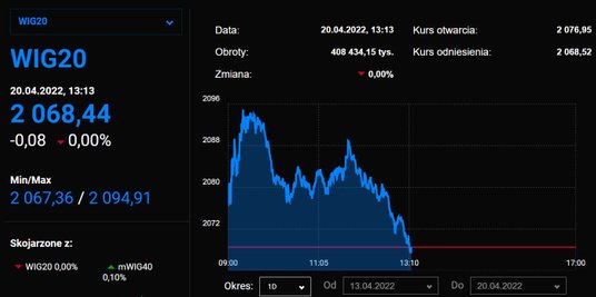 Od samego rana to kupujący mieli przewagę. Byki chciały odpracować choć część strat, jakie WIG20 poniósł poprzedniego dnia. Przypomnijmy, że we wtorek indeks największych spółek spadł o 1,2 proc. Kupujący mieli apetyt na 2100 pkt, jednak notowania WIG20 zdołały dotrzeć tylko do poziomu 2094 pkt. Po ustanowieniu dziennego szczytu, kurs zaczął się osuwać, aż po południu zszedł pod kreskę. Pod koniec handlu podaż zaczęła dociskać jeszcze mocniej i indeks zakończył dzień na poziomie 2047 pkt, co oznacza spadek o 1 proc.