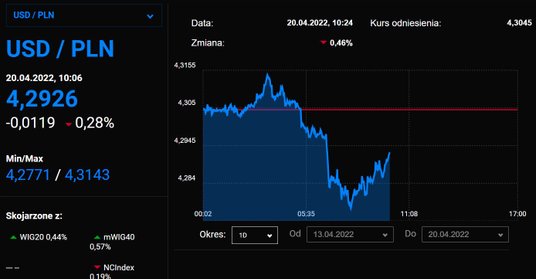 Polska waluta na początku sesji umacnia się wobec głównych par walutowych. Notowania USD/PLN spadają o 0,4 proc. Za dolara inwestorzy płacą mniej niż 4,30 zł. Z kolei wobec euro złoty umacnia się o 0,3 proc., do 4,63 zł.