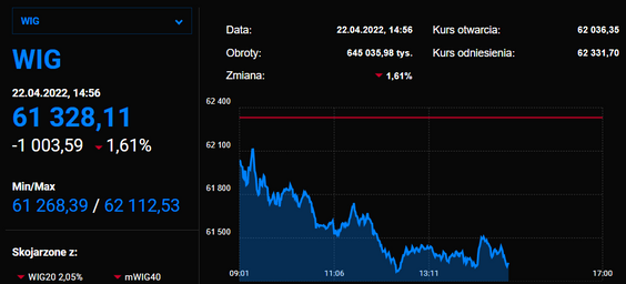 O poranku indeks największych firm zniżkuje o 0,6 proc., z kolei mWIG40 i sWIG80 odnotowują minimalne spadki nieprzekraczające 0,1 proc. Ostatecznie jednak WIG spada o 0,5 proc. Czerwień dominuje także za granicą. Niemiecki DAX spada o 1,1 proc., a brytyjski FTSE 100 - o 0,5 proc.