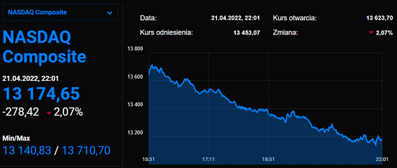 Indeks Dow zanurkował o 2.8 proc, do 33,823.82 pkt. i był to najgorszy dzień dla wskaźnika od 2020, S&P 500 spadł o 2.7 proc. osiągając 4,271.94 pkt., najniżej od marca. Nasdaq Composite zakończył tydzień spadkiem 2.6 proc. do 12,839.29 pkt. DJIA zniżkował o 1,9 proc. w skali tygodnia, co oznacza czwarty z rzędu spadek i dziewiąty z ostatnich 11 tygodni. Indeks S&P 500 zanotował 2,5 proc. tygodniowy spadek a Nasdaq stracił 3,6 proc.