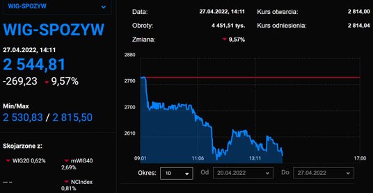 Spółki spożywcze rażą dziś słabością. Notowania WIG-spożywczy spadają o ponad 9 proc., a stopa zwrotu od początku roku wynosi już około -43 proc. Najgorzej radzą sobie ukraińskie spółki: Kernel tanieje o blisko 15 proc., a Astarta o ponad 7 proc.