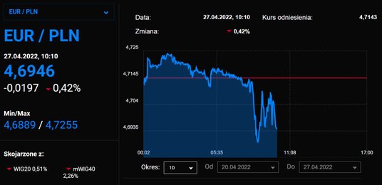 Polska waluta wczoraj wyraźnie się osłabiła względem euro czy dolara. Wpływ na to miała informacja o wstrzymaniu dostaw gazu z Rosji do Polski. Dziś jednak złoty próbuje odrobić część strat. Notowania EUR/PLN spadają o 0,4 proc. i są poniżej 4,7 zł. Za dolara inwestorzy płacą 4,42 zł.