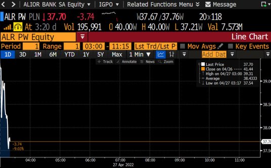 Bank opublikował dziś wyniki za I kwartał. Alior Bank osiągnął 169,2 mln zł zysku netto wobec 108,1 mln zł zysku rok wcześniej. Te rezultaty były gorsze od prognoz analityków. W efekcie notowania Alior Banku spadają o blisko 10 proc.