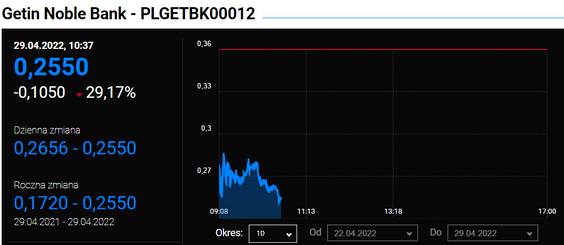Ubiegły rok bank zakończył stratą ponad 1 mld zł. I kw. udało się jednak zakończyć zyskiem sięgającym 18,6 mln zł. W kwietniu bank złożył do KNF plan naprawczy, zgodnie z którym odbudowuje wskaźniki kapitałowe do 2027 r. Całkowita luka kapitałowa ma sięgać 4,5 mld zł. Przed godziną 11 notowania spadały o niemal 30 proc.