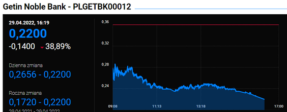 Po publikacji wyników za ubiegły rok i I kw., inwestorzy masowo zaczęli sprzedawać akcje banku. Cena akcji w ostatnie minuty przed końcem sesji spadała o ponad 38 proc., wartość obrotu sięgała niemal 12 mln zł.