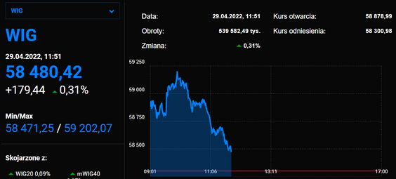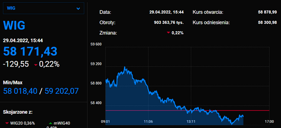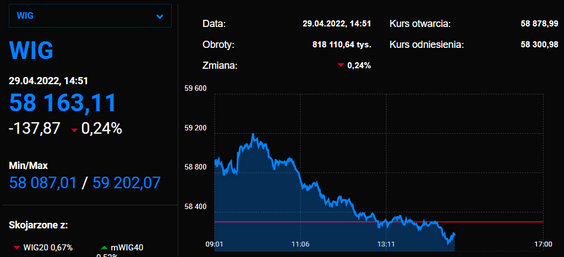 Choć na początku dnia wydawało się, że to kupujący mają znaczącą przewagę, to po publikacji wyższego od założeń ekspertów szacunku dotyczącego inflacji w kwietniu na poziomie 12,3 proc. nastroje znacząco się pogorszyły. Ostatecznie indeks szerokiego rynku spadł o 0,9 proc., WIG20 o 1,4 proc., a sWIG80 o 0,2 proc. Nieśmiałe zwyżki zaliczył indeks średnich firm, o 0,2 proc. Wartość obrotów sięgnęła 1,4 mld zł.