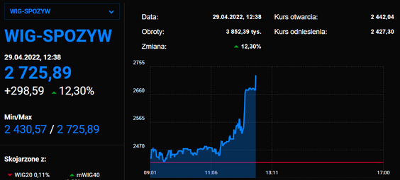 Podczas piątkowej sesji wspomniany indeks rośnie o ponad 12 proc., głównie za sprawą bardzo dobrej dyspozycji ukraińskich spółek rolnych. Akcje Kernela drożeją o ponad 19 proc., KSG Agro o 14 proc., a Astarty - o niemal 10 proc. Może to być reakcja na rozpoczynającą się kampanię siewną.