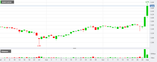 Akcje zwyżkują w poniedziałek o około 18 proc., do 4,78 zł. W piątek poinformowano, że spółka chce wypłacić dywidendę 0,92 zł na akcję.