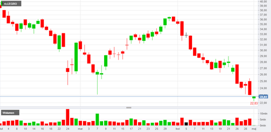 Po ponad 5-proc. przecenie Allegro w piątek, początek pierwszej sesji maja również jest kiepski dla handlowej platformy. Po kwadransie akcje zniżkują nawet około 1,6 proc., wyznaczając nowe historyczne minima