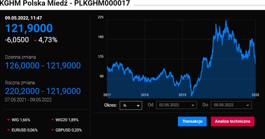 Akcje KGHM kontynuują przecenę. Tracą dzisiaj ponad 4 proc. co jest najsłabszym wynikiem w indeksie WIG20. Ich wycena oscyluje w okolicach 121 zł za papier. Ostatnio tak tanie były w 2020 r.