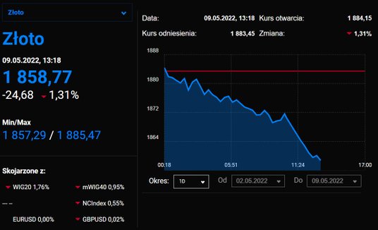 Globalna ucieczka od ryzyka tym razem nie pomaga nawet notowaniom złota, które uznawane jest za bezpieczną przystań. Silny dolar nie pozostawia bowiem zbyt wielu opcji. Złoto tanieje dzisiaj o około 1,5 proc. i spada w okolice 1860 USD za uncję.