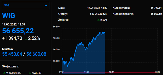 W połowie dnia zwyżki indeksów na warszawskiej giełdzie przybierają na sile. Indeks szerokiego rynku rośnie o 2,5 proc. Inwestorzy najchętniej kupują walory spółek z WIG20, który rośnie o 2,9 proc. Indeks mWIG40 zyskuje niespełna 2 proc., a sWIG80 - 0,7 proc. Wśród branżowych indeksów wyróżnia się WIG-spożywczy, który zyskuje dzięki dobrej dyspozycji ukraińskich spółek. Na uwagę zasługuje również rosnący o 5,4 proc. WIG-gry oraz zyskujący 3,6 proc. WIG-banki.