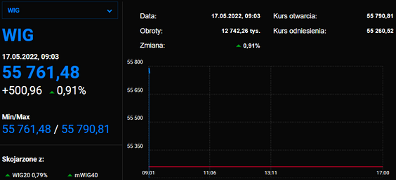 Na starcie sesji dopisują byki. WIG rośnie o niespełna 1 proc., a wraz z nim wszystkie główne indeksy. WIG20 rośnie o 0,7 proc., podobnie mWIG40. Na wykresie indeksu małych firm obserwujemy mniej stanowcze, 0,2 proc. wzrosty. Nastroje dopisują też na innych europejskich parkietach. Niemiecki DAX zwyżkuje o 0,9 proc., CAC 40 o 0,7 proc., a FTSE 100 - o 0,3 proc.