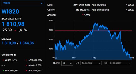 Huśtawka nastrojów na GPW. Mieliśmy spadek w pierwszej części notowań, mozolne odrabianie straty, a na koniec powrót do spadków, głównie za sprawą przeceny na Wall Street. WIG20 zamknął ostatecznie notowania na poziomie 1810 pkt.