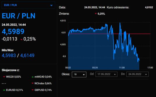 Trwa aprecjacja złotego. Druga połowa dnia przynosi umocnienie tego ruchu i w efekcie wycena euro zjeżdża poniżej poziomu 4,60 zł. Dolar z kolei jest poniżej 4,30 zł.
