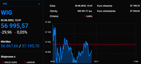 Indeks szerokiego rynku zniżkuje o skromne 0,1 proc., podobnie jak indeks dużych i średnich spółek. Z kolei sWIG80 zniżkuje o 0,5 proc. Wśród branżowych indeksów wyróżniają się WIG-górnictwo i WIG-banki rosnące o odpowiednio 2,3 proc. i 1 proc.