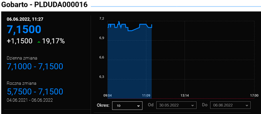 Akcje Gobarto, drożejąc o prawie 20 proc., są dziś liderem zwyżek na warszawskiej giełdzie. Do zakupów zachęciła inwestorów informacja o planowanym wezwaniu, które zamierza ogłosić Cedrob oferując 7,25 zł za akcję. W wyniki poniedziałkowego skoku kursu rynek wycenia akcje Gobarto po ok 7,20 zł.
