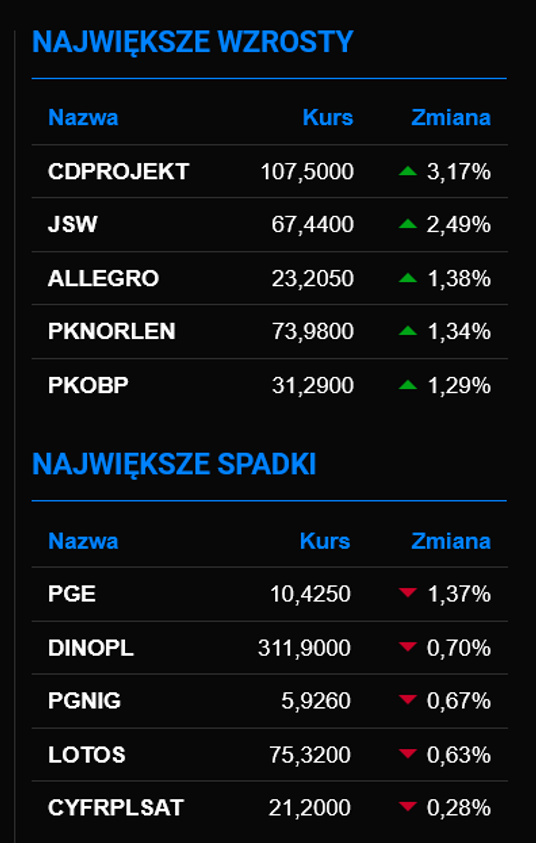 Krajowe indeksy powiększają przewaga, a motorem zwyżek są największe spółki. WIG20 jest już ponad 1 proc. na plusie. Zwyżkom przewodzi CD Projekt, którego kurs rośnie o ponad 3 proc. Na solidnych plusach notowane są także akcje JSW, PKN Orlen i KGHM. Do zwyżek podłączyły się również banki, których papiery w komplecie znajdują się nad kreską. Na drugim biegunie, wśród przecenionych walorów, znajdują się m. in. PGNiG , PGE i i Lotos, których inwestorzy chętnie się pozbywają. Skala zniżek jest jednak ograniczona.