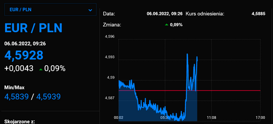 Złoty nieznacznie osłabił się względem najważniejszych walut. Za euro inwestorzy płacą ok. 4,59 zł, frank szwajcarski kosztuje prawie ok. 4,48 zł, a dolar wyceniany jest nieco poniżej 4,28 zł.